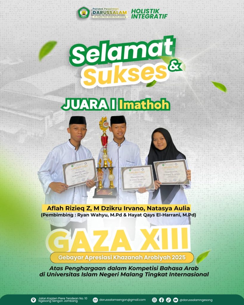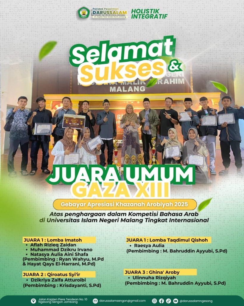Prestasi membanggakan kembali ditorehkan oleh santri Pondok Pesantren Darussalam Ngasengan Jombang dalam ajang bergengsi GAZA XIII (Gebyar Apresiasi Khazanah Arobiyah 2025) yang diselenggarakan oleh Universitas Islam Negeri (UIN) Maulana Malik Ibrahim Malang pada tingkat internasional.